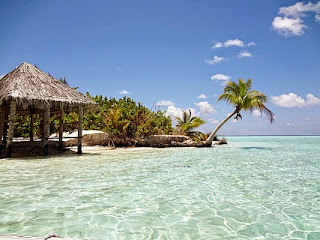 Another view of the reef and the sand shelf behind it. We are in the lagoon behind the sand shelf in this atoll. Not such great snorkeling when there is such a broad, shallow shelf of sand. The dropoff is so steep that even the coral doesn't grow on it. Pretty colors and it was nice to hear the waves crashing in the distance on the reef.
