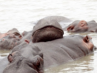 Hippos in the estuary waters. The river is blocked from the ocean these days so the water doesn't get flushed anymore. Hippos eat 60 kg of grass a day and what goes in must come out, so you can imagine the nutrients in that water!