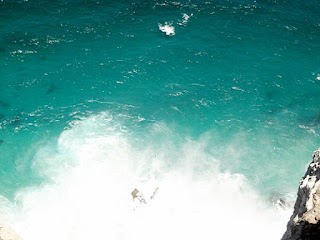 Looking down over the battlement wall into the spray from crashing waves. Don't do this if you have vertigo!