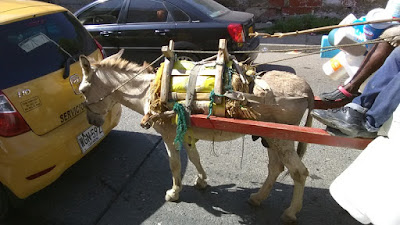 The streets of Cartagena still see donkey carts and hand carts. These two guy have more plastic containers than I've ever seen. And I love the cardboard hat.