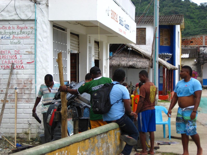 Outboard motor repair seems to be done by group consensus on the street, too.