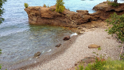 A mushroom in its final days along a trail. The gills now look like fringe and the hole through it makes it look like something was gnawing on it. Just different.Overlooking a small stony beach cove along Lake Superior.