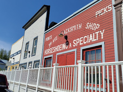 Someone's home just a block from downtown. Tall and skinny, I wonder how they keep it heated in this cold climate. Leslie from the gold workshop told us their fire alarms go off at -60 degrees Fahrenheit as they aren't build to withstand that kind of cold. And that isn't too uncommon up here in the winter!The old Downtown hotel looks just like and Old West Saloon. Its famous for its Sour Toe Cocktail. Miners and other folks coming up here for the gold rush were referred to as "Cheechakos" until they had survived their first full winter here. After that, they could be called "Sourdoughs". The SourToe is a takeoff on that term.
