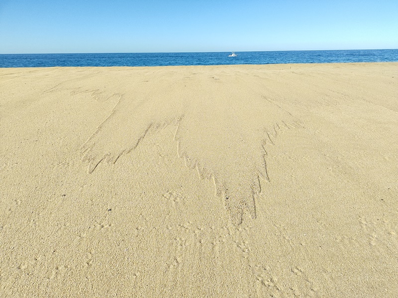 The water at the far end of the beach didn`t soak into the sand as expected very quickly. There must be rock below the sand and I could see percolating holes that left ripples in the water surface as the water bubbled down into some underground hole
