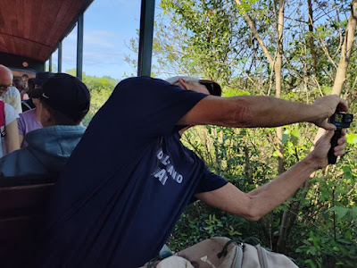 Red rocks and white rocks were both filled with spires and towers and fantastic shapes created by eons of wind and water.Inside Iguazu Falls park, we took the train to the Devil's Throat walk (which was closed due to too much water flow!). Here, Jason is taking a picture of something off the side of the train.